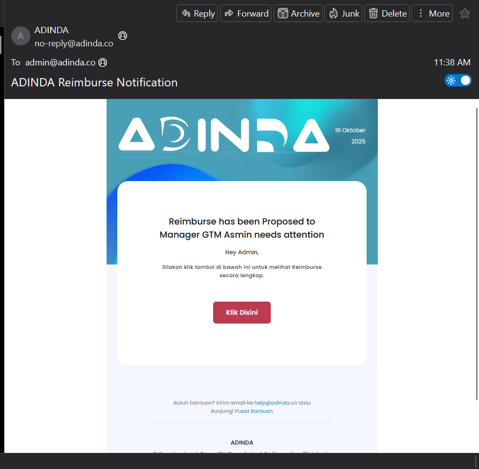 - Mohon untuk Trust Email no-reply@adinda.co untuk menerima notifikasi secara langsung tanpa harus melihat Folder SPAM