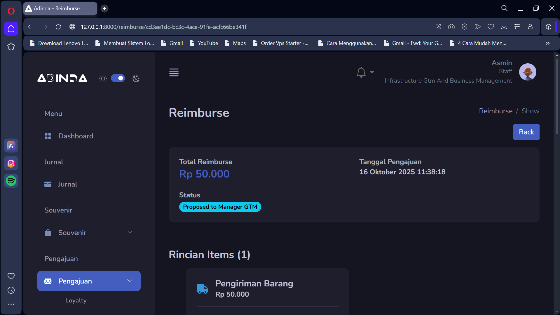 Buka halaman pengajuan Reimburse, lalu pilih salah satu reimburse yang di ingin di proses