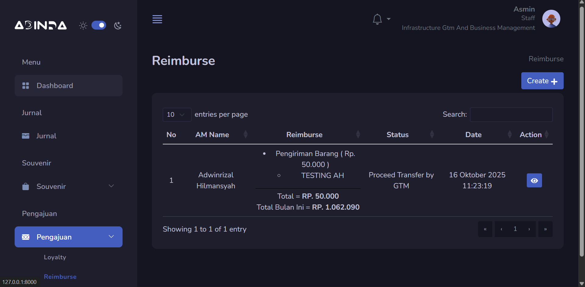 Buka halaman pengajuan Reimburse, lalu pilih salah satu reimburse yang di ingin di proses