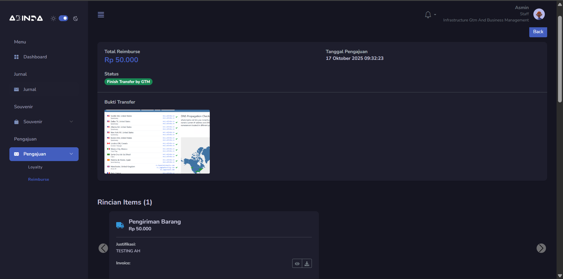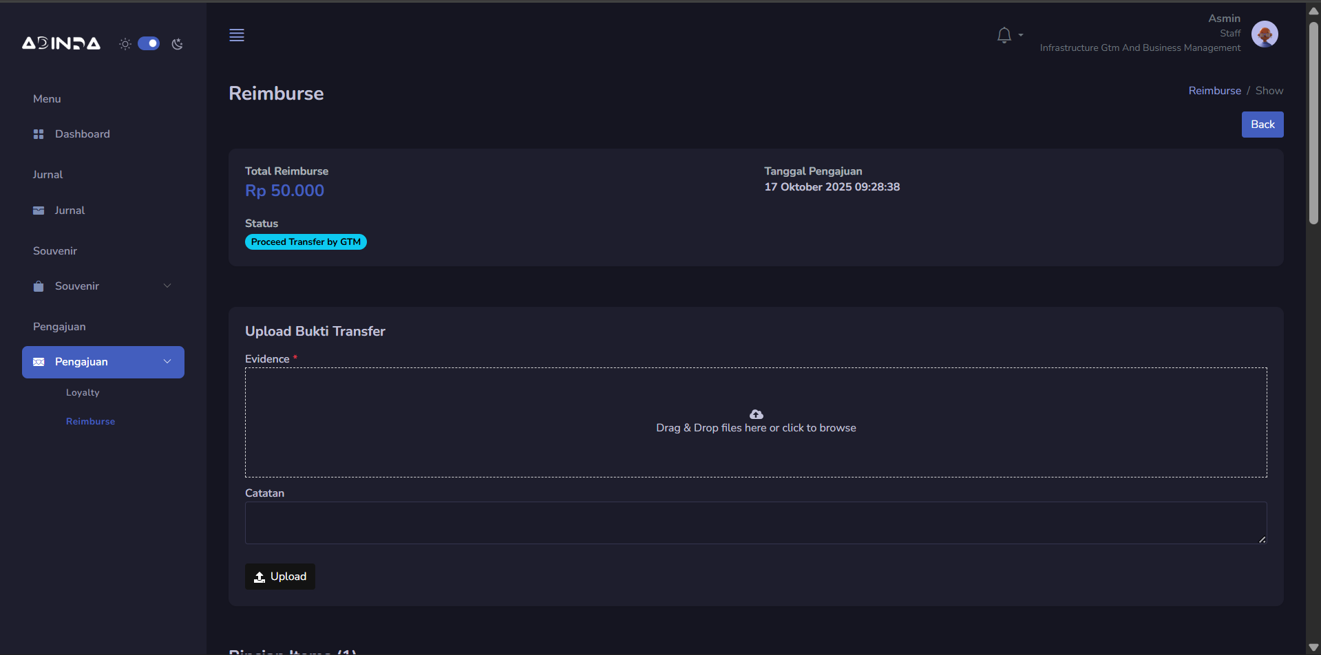 Upload file sebagai bukti bahwa Pengajuan Reimburse telah di transfer